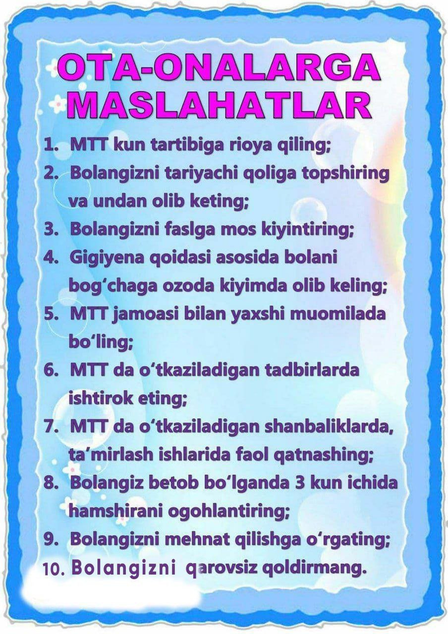 Ota-onalarga / Huquq va majburiyatlar ota-onalarga tavsiyalar ... 22-09-2023, 23:0422-09-2023, 23:04 yangibozor27-dmtt