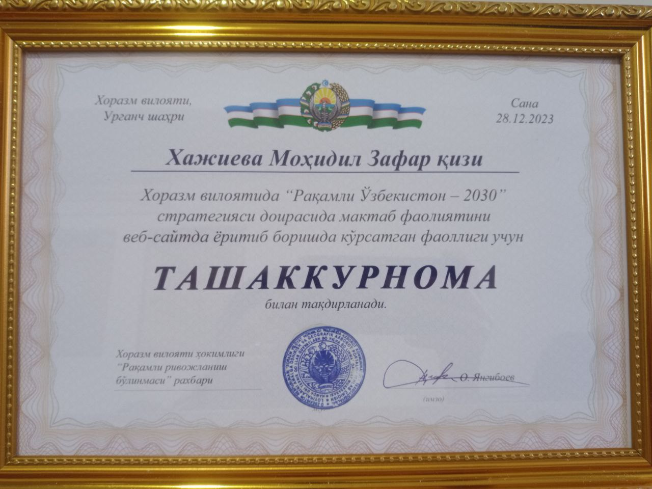 Ассалому алайкум Ракамли Ўзбекистон 2030 стратегияси доирасида мактаб ва МТТ фаолиятини Веб- сайтда ёритиб боришда вилоятда 30 нафар веб-сайти еритаётган маьсуллар такдирланди шуларни ичида Янгибозор тумани 27 сон ДМТТ метадисти Хаджиева Мохидил Зафар кизи хам голиблар каторидан ўрин ОЛИБ Вилоят хокимлигининг ташаккурномаси ва эсдалик совгаси билан такдирланди бу кизимизни ишларига омад тилаймиз 👏👏👏👏👏